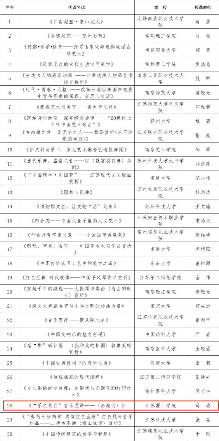 近日,省教育厅公布了2023年江苏省高校美育大讲堂优课名单,我院马凌教授《“乐之秋白”音乐党课--〈赤潮曲等〉》课程成功入选。