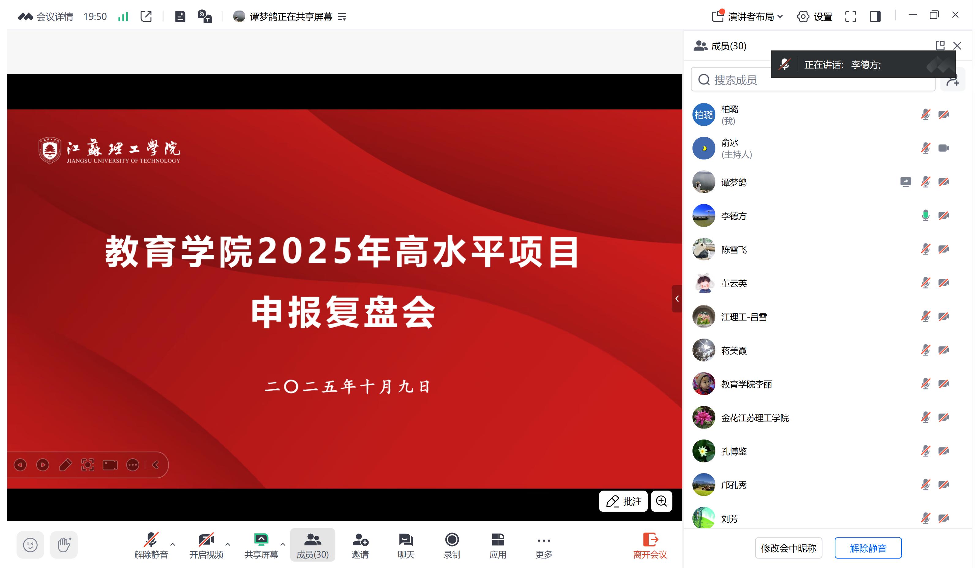 2025年10月9日晚,我院在线上召开了2025年高水平项目申报复盘会。会议旨在总结2025年高水平项目申报经验,查找不足,凝练方向,并为2026年申报提前谋划。会议邀教育学院院长李德方、研究生副院长张长英、马建富、方翰青等四位教授担任指导专家,全体项目申报教师参会,会议由副院长俞冰主持。
