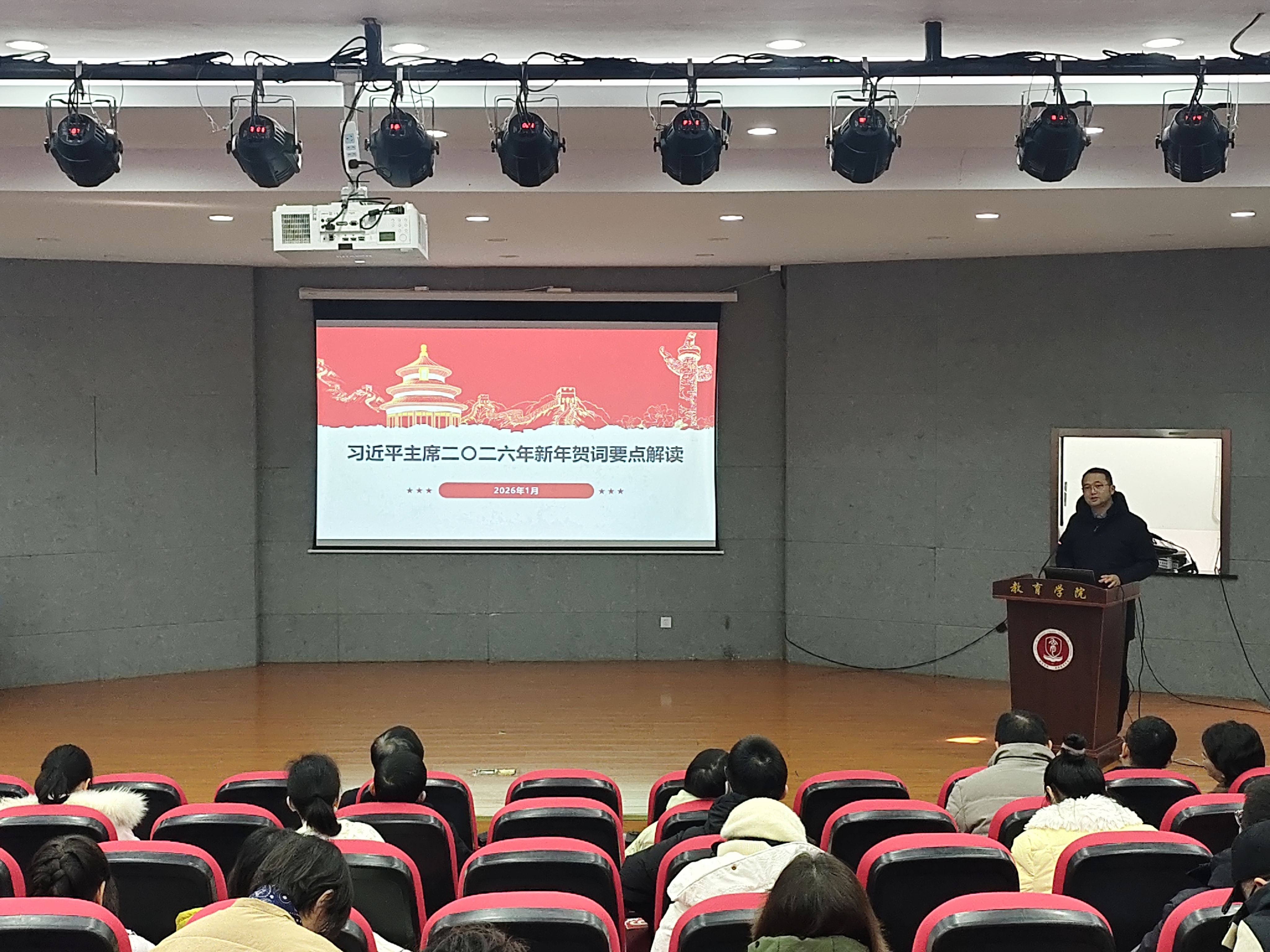 第三项议程为政治理论学习。会议组织学习国家主席习近平发表的二〇二六年新年贺词,以及习近平总书记在《求是》杂志上发表的重要文章《学习好贯彻好党的二十届四中全会精神》。会议要求,全体教职工在学习中把握核心要义,联系学院发展实际和岗位职责,进一步统一思想、凝聚共识,把学习成果转化为改进作风、提升治理效能、推动学院高质量发展的实际行动。